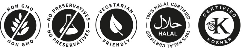 Gluten, Wheat, Dairy, Soya, Preservatives, Sugar, Starch, Salt, GMO, Artificial Colors or Flavors